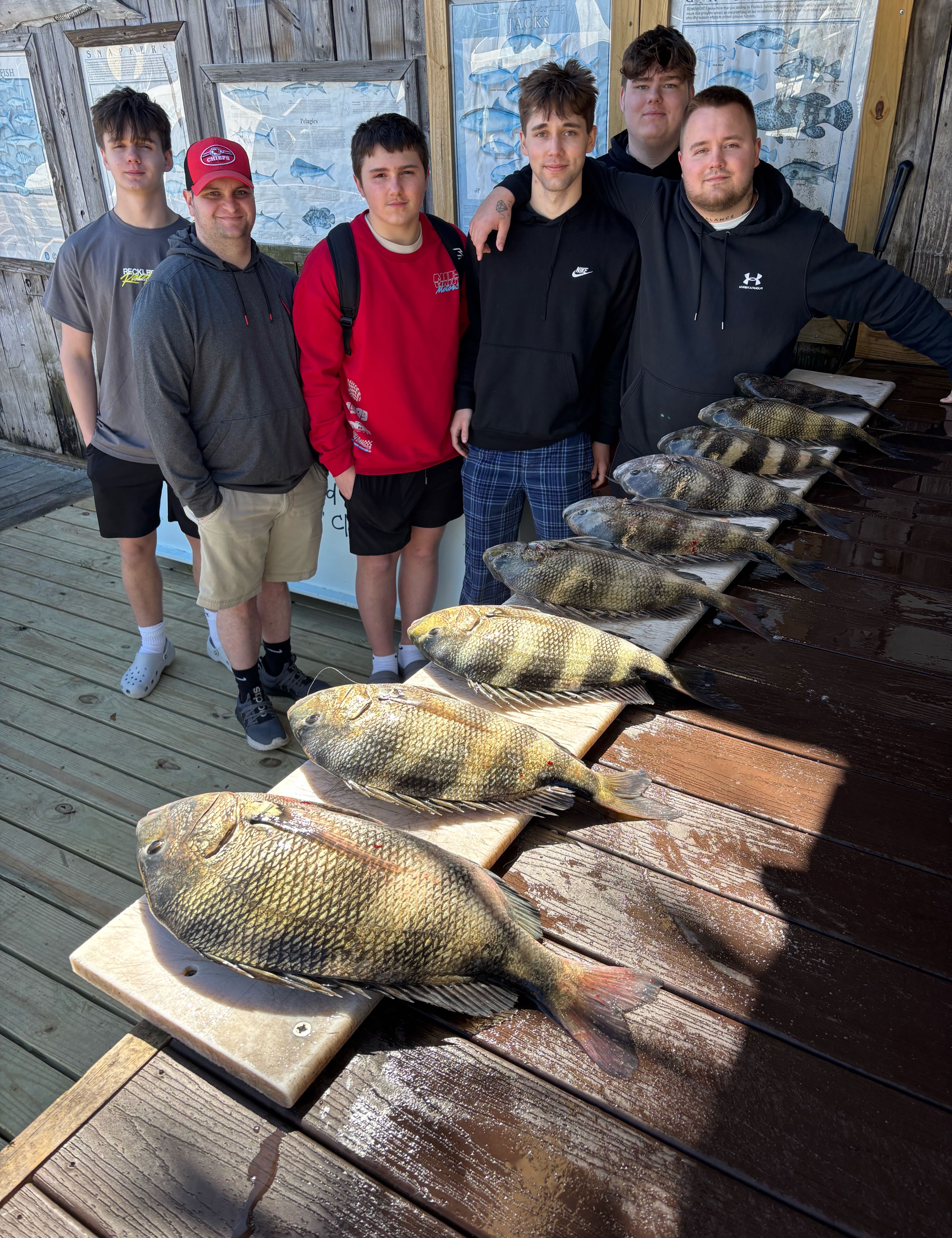 Sheepshead are the "convict fish" of Pensacola with their black and white stripes, but don't let their looks fool you - they're some of the best eating around. These guys run 2-8 pounds typically and have human-like teeth for crushing barnacles and crabs off structure. You'll find them year-round around dock pilings, bridges, and jetties, but winter months are when they really stack up before spawning. What makes them fun is they're notorious bait thieves with light, finicky bites. The white, sweet meat is worth the effort though. Use small hooks with fiddler crabs or shrimp, and get tight to structure - I mean tight. Here's the trick: when you feel them pecking at your bait, don't jerk. Let them load up, then set the hook hard. Their mouths are tough as nails.